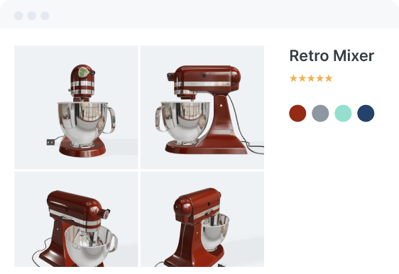 Turn your product’s 3D models into 3D configurators, AR experiences, or photorealistic product images and videos.