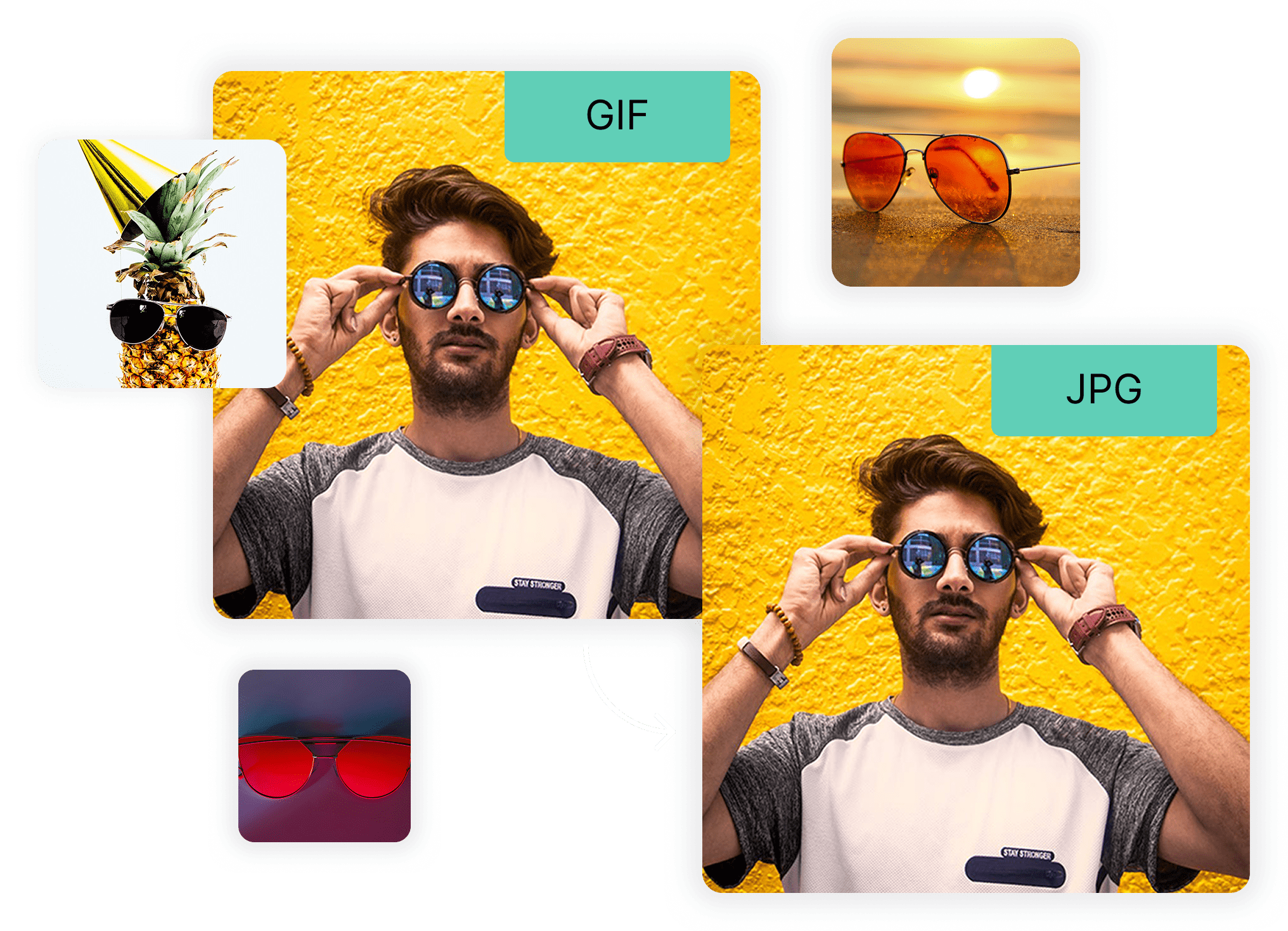 Easily convert GIF to JPG online instantly and effortlessly. No installation or plugins required. Simply drop your GIF image into our converter, and receive your JPG file in seconds with no loss in quality.