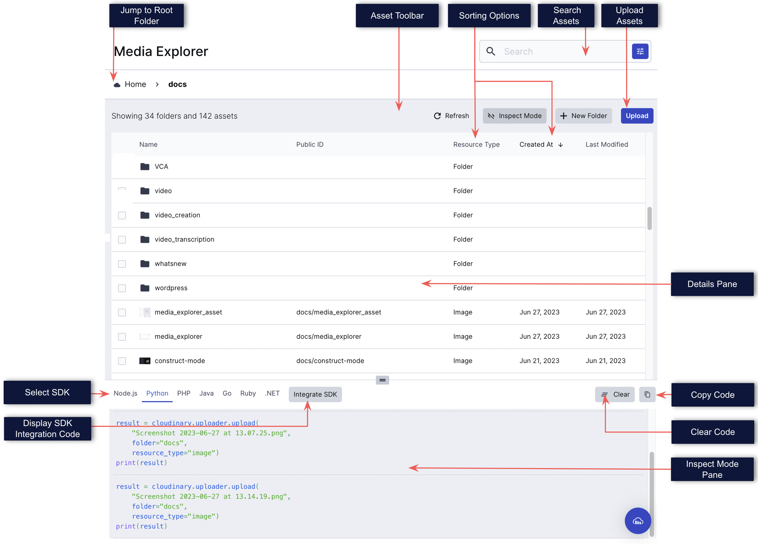 The Media Explorer is a tool for you to easily view, browse and search the assets in your media repository, and is focused on helping you to learn and onboard quickly to easily integrate Cloudinary functionality within your own code. The explorer also helps you debug and troubleshoot your code, and provides a UI that is fully visualized and reflects a developer work space.