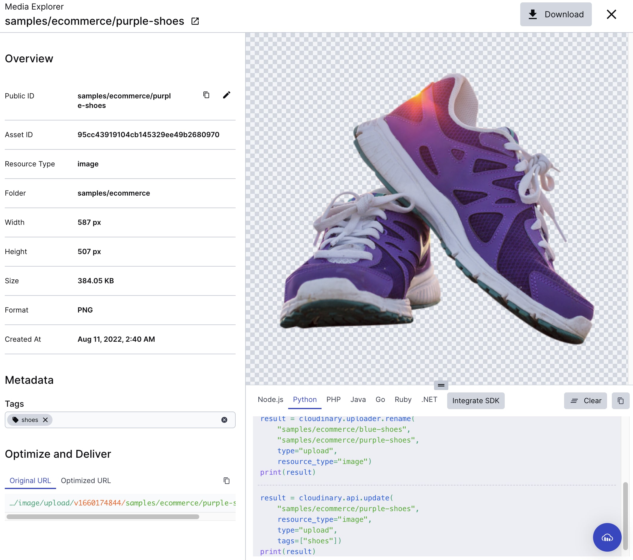 The explorer provides an Inspect Mode to help you learn and onboard to Cloudinary, and see the code snippet for replicating any actions made within the UI. This snippet can then be copied to your own code to provide the same functionality programmatically. The snippet is generated for each of the Cloudinary SDKs, which are displayed on separate tabs in the code preview pane. For example in the image above, the code preview pane shows the code for the two most recent actions performed in the UI, one to rename an asset, and the other to update an asset with a new tag.