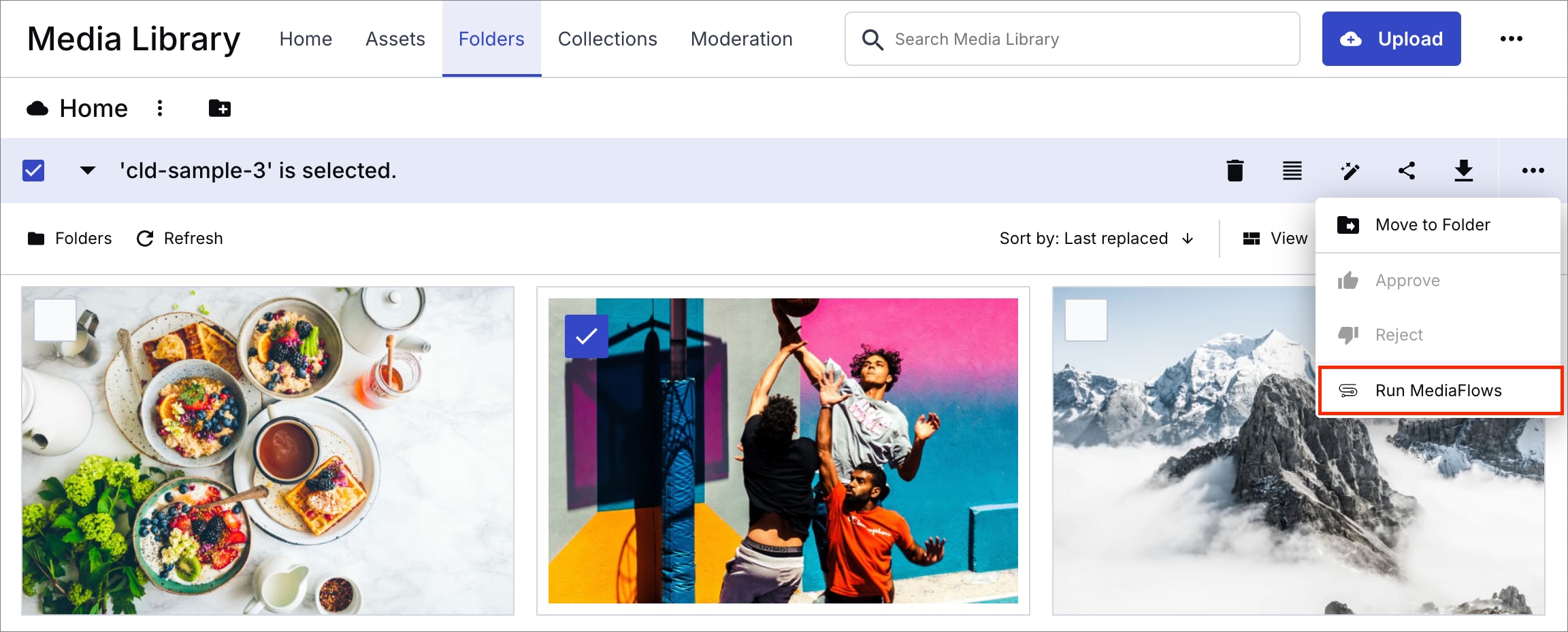 Select an asset in Cloudinary’s Media Library and click Run MediaFlows from the menu.